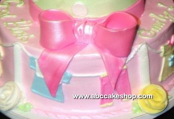 Pink, green, yellow, blue, and white all make their way onto this precious two-tiered baby shower cake. A hand-drawn clothesline on the bottom tier is […]